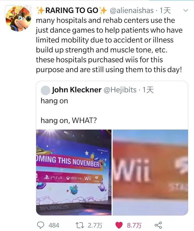 这个名为RARING TO GO的网友回应称,许多医院和康复中心都在使用《舞力全开》这款游戏,帮助因事故或疾病而行动不便的患者增强力量和肌肉张力。这些医院购买了Wii,至今仍在使用——这就是为什么育碧到现在还坚持让《舞力全开》新作登陆Wii平台的原因。