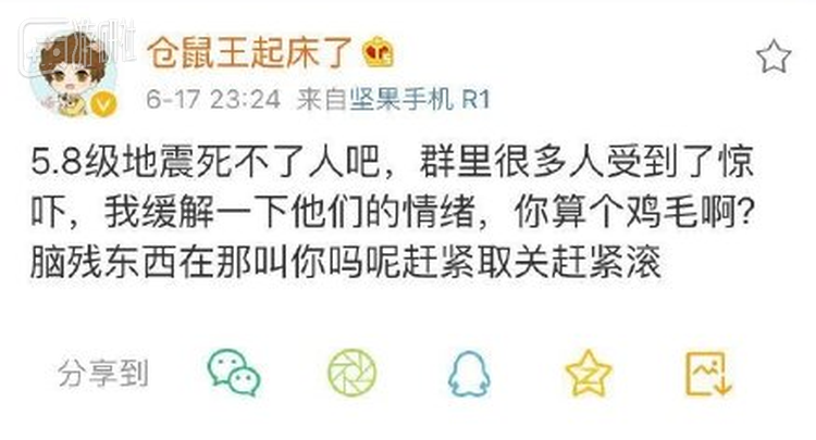 虎牙主播“仓鼠王”,微博ID为“仓鼠王起床了”,于昨晚23时09分和23时24分,分别发送了两条内容与地震相关的微博,其中一条微博内容为“下次地震要是大家觉得实在跑不了了,记得一定把所有钱充金豆然后给我刷了呀”。