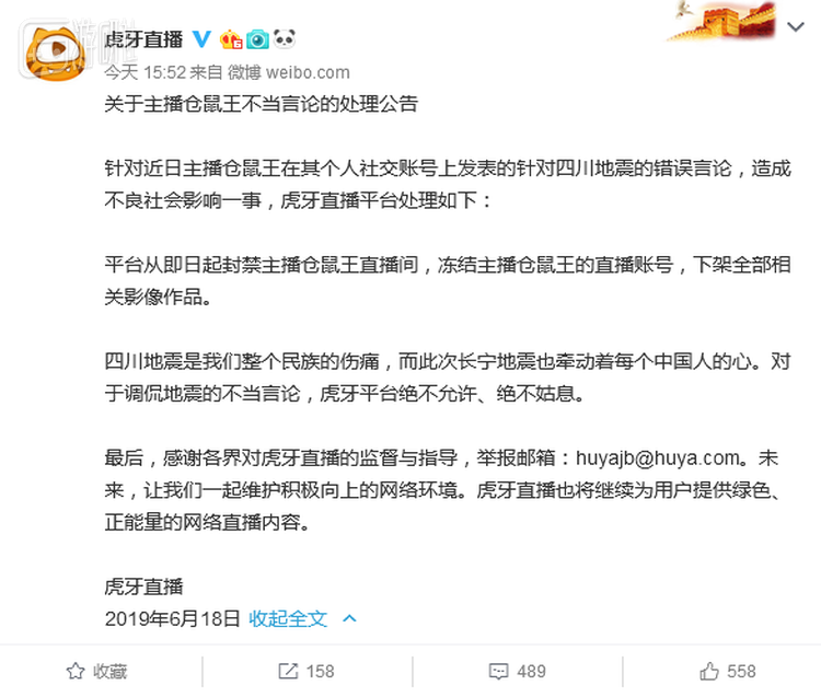今天下午,两名主播的直播间已经无法在网站中搜到,他们之前发过的相关微博也已经删除。虎牙直播官方微博已就此发表声明,宣布这次封禁的理由是仓鼠王“发表的针对四川地震的错误言论,造成不良社会影响”。