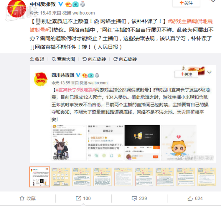 而在余震尚未结束的今天,两名游戏主播因发表对地震的相关言论被封号。