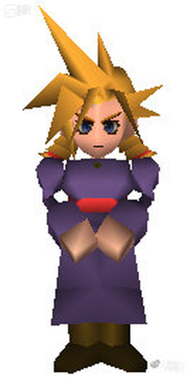 在1997年,这段剧情给玩家们带来的震撼简直难以言表。尽管当时的游戏像素还很有限,克劳德女装之后的样子也不甚清晰,只能勉强看出他穿上了一件带蝴蝶结的外衣,梳起了双马尾,但克劳德的女装造型很快深入人心。