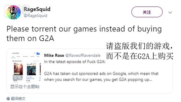 “如果你准备在G2A上买我们的游戏,没必要,你只要去玩盗版就好了”,Mike在推特上说,“反正不管怎样我们都拿不到一分钱,我宁愿不让G2A拿到抽成”。《速降王者》的开发商也对此表示了支持,他们表示如果玩家没钱买正版或者不想全价买游戏,那干脆去玩盗版好了,总好过从G2A上买——那样他们还要支付银行的罚款,这些年来,G2A让他们在客服、调查假Key等工作上花费了大量时间。