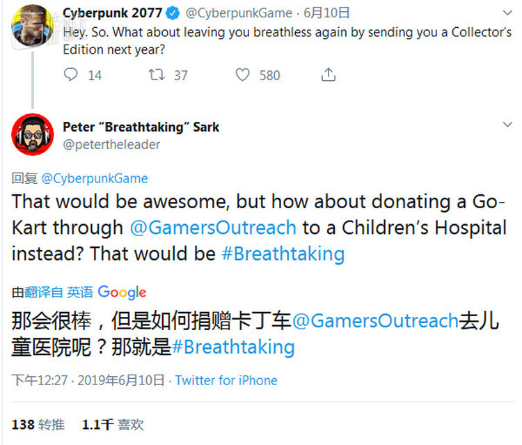 甚至连CDPR官方也和他交谈,想要送给他一份价值250美元的《赛博朋克2077》典藏版。不过Peter Sark拒绝了这份意料之外的礼物,他转而回复CDPR,希望他们能改为捐赠一辆玩具车给一家儿童医院。