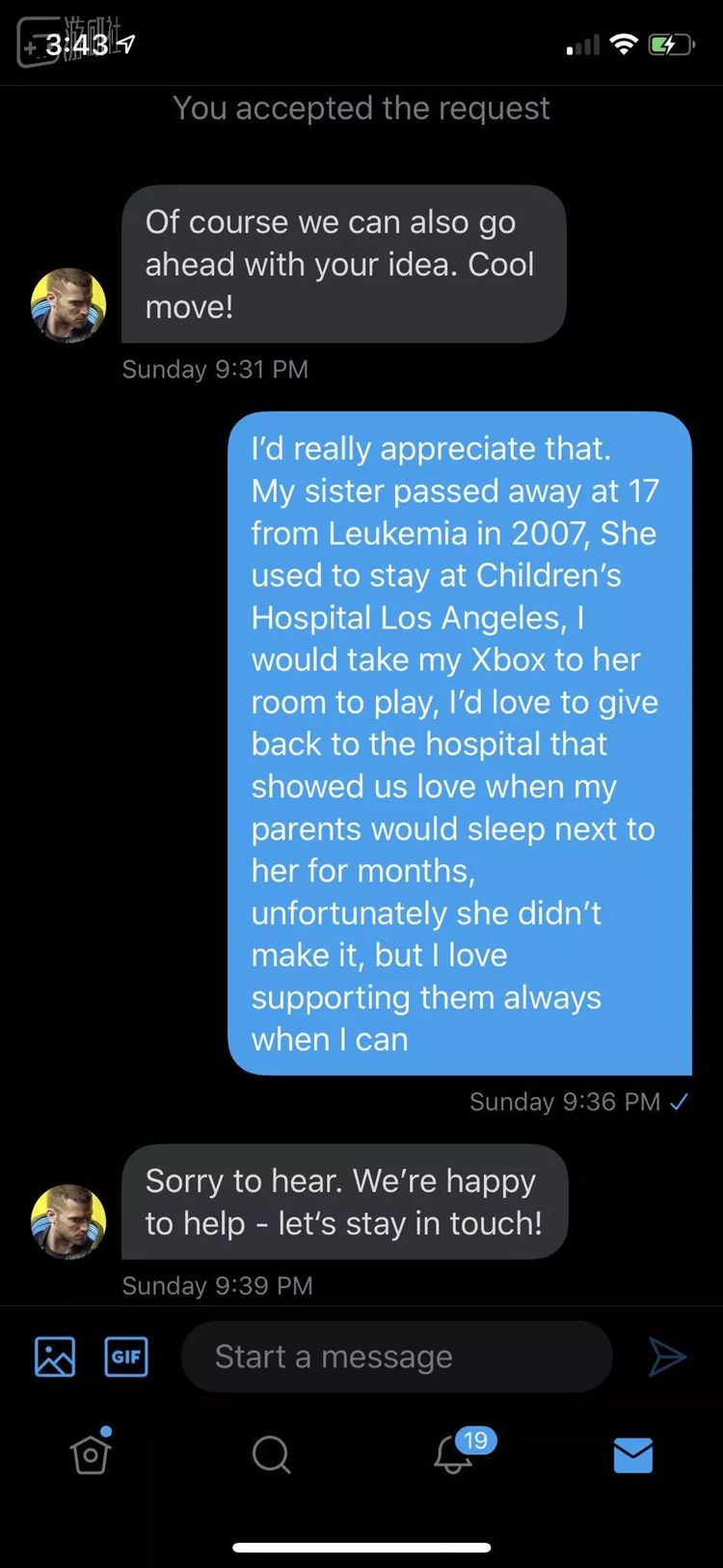 我非常感谢你们送我游戏。我妹妹2007年的时候因为白血病去世,当时她17岁。之前她曾在洛杉矶的儿童医院接受治疗,我曾经带着我的Xbox去她的病房和她一起玩。我希望能回报那家带给我们爱的医院,很不幸她没能(被那家医院)治愈,但只要我力所能及的时候我都会为那家医院做些事情。