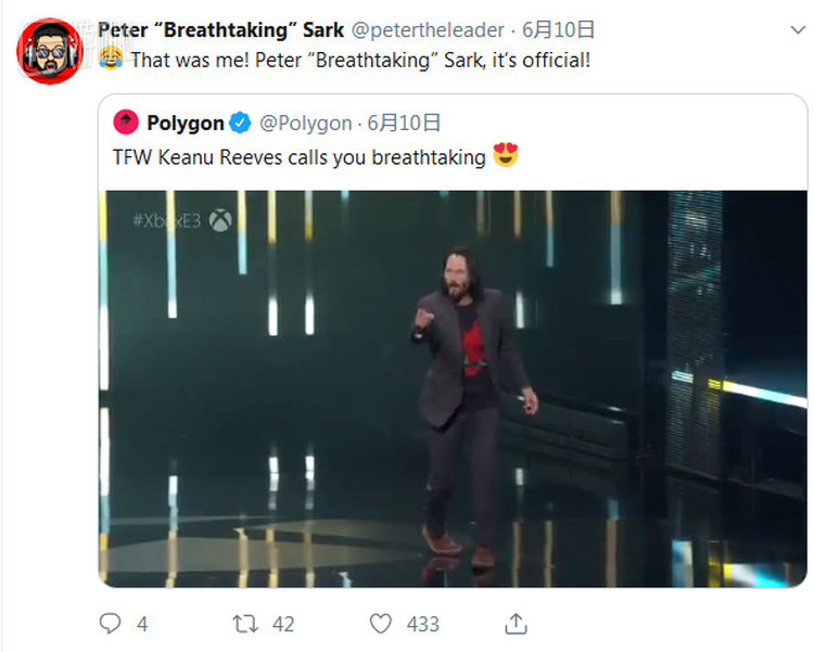 不过这一切都在6月10日那一天改变了。那一天,他对着基努·里维斯高喊“You are breathtaking”的身姿被全球各地的游戏媒体记录在笔下,从此和Breathtaking这个词结下了不解之缘。