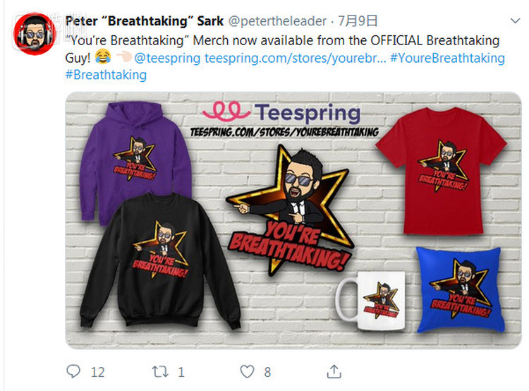 但可以注意到,他依然在推特上执着地使用“Breathtaking”标签。最近还以此为主题,增加了新的业务,卖周边。