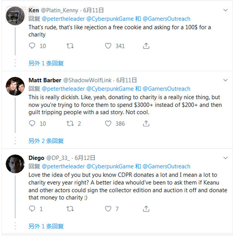 这个回复翻起了些许波浪。有人质疑他利用这个事件来炒作自己,或者是在利用自己获得的名气来强迫CDPR——毕竟,一份豪华版游戏的售价只有250美元,而他希望CDPR捐赠的玩具车则价格高达3000美元以上。