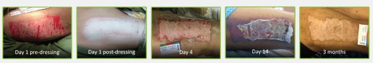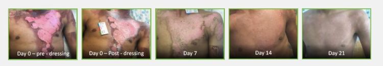 受试者中,有一名58岁的男性患者,因治疗鳞状细胞癌,他接受了植皮手术。这块移植皮的面积为170平方厘米、0.3mm深。官方对伤口进行了2层喷射,详细记录了他使用机器后,皮肤发生的变化:刚开始,皮肤被材质完整地覆盖,慢慢伤口开始愈合;经过2周之后,上表皮开始脱落;3个月后,整块伤口得以康复。