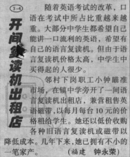 复读机广告的狂轰乱炸以及迅速增长的市场需求,还给一些人带了新商机。为农民提供致富信息的《农村百事通》,就曾在“金点子·金不换”栏目里刊登过一则很有时代气息的致富信息——《开间复读机出租店》。