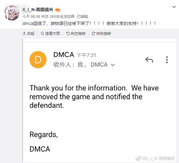 直接沟通无果,XIN只能寻求其他渠道进行维权,经网友提醒,XIN向Steam提交了DMCA版权侵权投诉,如果Steam判定抄袭属实,可以直接将其游戏下架。