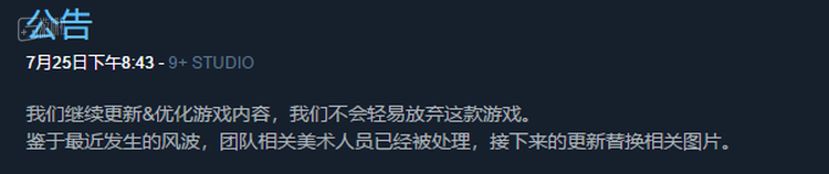制作组仅通过Steam页面发表了公告,表示“鉴于最近发生的风波,团队相关美术人员已经被处理,接下来的更新替换相关图片”,“之后将继续更新&优化游戏内容,不会轻易放弃这款游戏。”