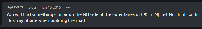 “你可以在新泽西州I-95的外部车道的NB侧找到类似的东西,就在6号出口的北面。我在建造道路时丢失了手机。”