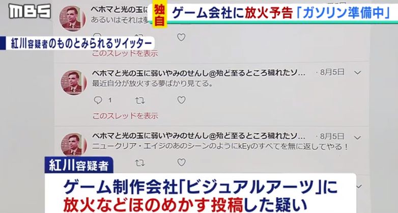 可能正是因为这层联系,8月时,25岁的临时工红川才喜在推特上表达对Visual Art's的不满时,才多次提到了京都动画不久前的惨案。在推特上,他提到自己最近梦见了放火的场景,又表示“汽油正在准备中”。这些推文被认为是在暗示他要对Visual Art's公司纵火,大阪警方决定逮捕红川才喜。据警方的消息,红川已经承认他对Visual Art's发起了纵火威胁。
