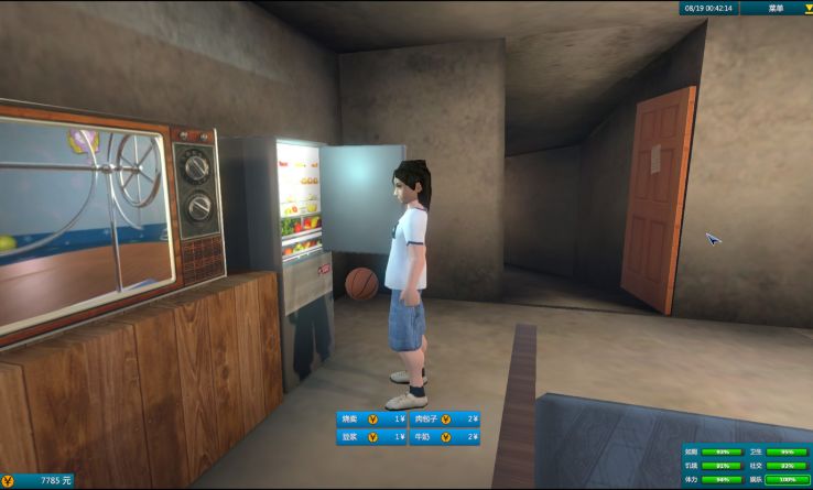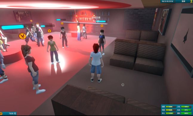 但从画面到玩法,我很难找出什么“有趣的元素”,甚至只需3分钟,我便体验完了游戏的全部内容:在一个名为“白石洲”的小地图上打工——指在特定的位置站立读条,消费——指购买补充饥饿度的食物,娱乐——站在特定场所等待人物娱乐点数的上涨。游戏的自由度和完成度都相当低。