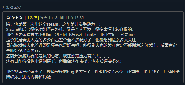对于这些评价,虚妄的反应相对平静,她和我说:“能看到有人支持自己的游戏,还是非常高兴的。”她也明白游戏目前的不足之处,对于玩家所反映的优化、Bug、流程短的问题,她表示正在抓紧时间完善。