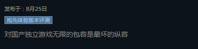 过去我们时常能听到这样的言论:国产独立游戏开发不易,需要玩家的宽容和耐心。即使一个游戏有这样那样的缺点,我依旧能看到许多玩家在指出不足后,善意地打出好评。正如许多游戏作者希望的那样:宽容地对待一款国产游戏。