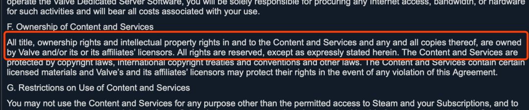 这份协议最大的争议点之一,就在于Steam将自己定义成一项订阅服务。这也就意味着平台上的内容和服务的所有权都属于Valve或者相关的许可方,玩家享受的只是游戏的使用权而已。(可以参考Steam订户协议的2.F条)
