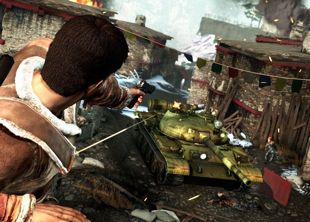 当然,事件脚本式的追击场面,并非都是粗制滥造或者是套路化的代名词。《神秘海域》每一部作品都将追击/逃脱场面作为中后期流程的压轴大戏,无论是2代的坦克和武装直升机,4代的轻型装甲车,玩家基本无法对其作出有效的反制,只能在其超强机动力和火力的压迫下夺路而逃,游戏的节奏也被完全带起。