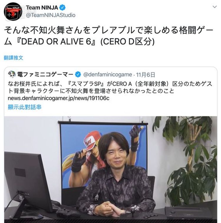 而且,其实不只是玩家在拿樱井的“我们是全年龄游戏”玩梗,同行们也没有放过这个机会。比如隔壁的Team Ninja,就在推特上顺带推广了一下自家的游戏:“想在格斗游戏中享受可以操作的不知火舞吗?来玩玩我们的《死或生6》(17禁)吧!”