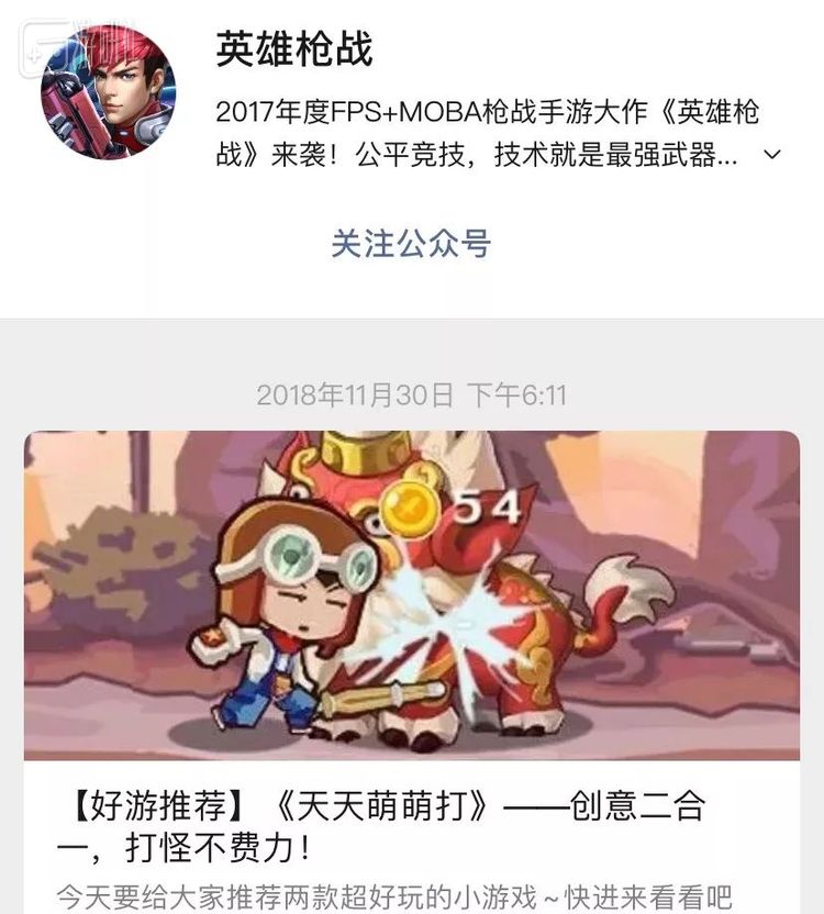 毕竟,《英雄枪战》这款产品早已走到了生命周期的尾声,它的微信公众号最后一篇推送已经是去年11月底的事,而且内容还是推荐4399旗下的另一款游戏。
