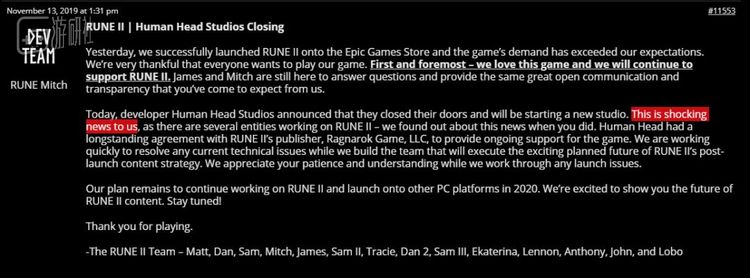在这份公告中,Human Head表示《符文2》是他们的最后一款游戏。在以独立游戏工作室的身份制作了22年游戏之后,经济上的窘迫迫使他们最终不得不做出关闭公司这一决定。