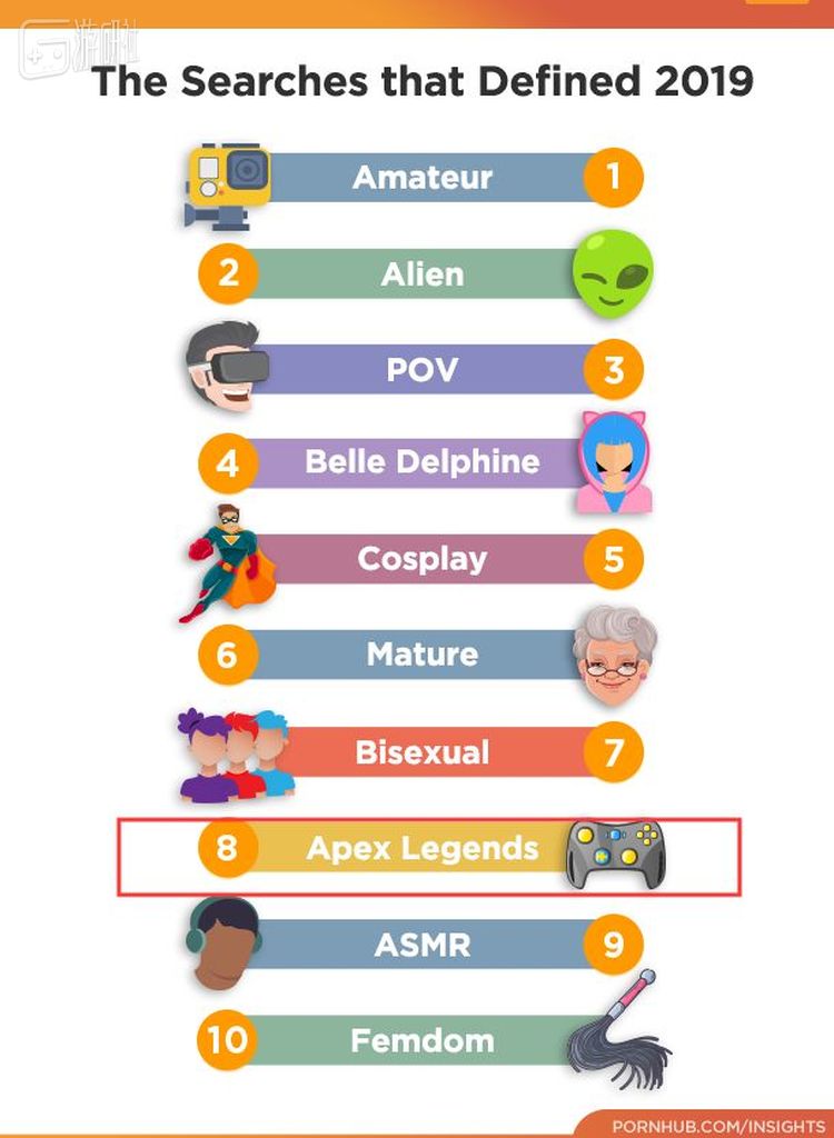 值得广大游戏玩家反思的是,在今年Pornhub网站公布的十大搜索关键词中,与游戏内容相关的仅有“Apex Legends”,且排名也掉到了第8位,与去年“堡垒之夜”一词荣获亚军,“库巴姬”上榜的盛况完全没法比。