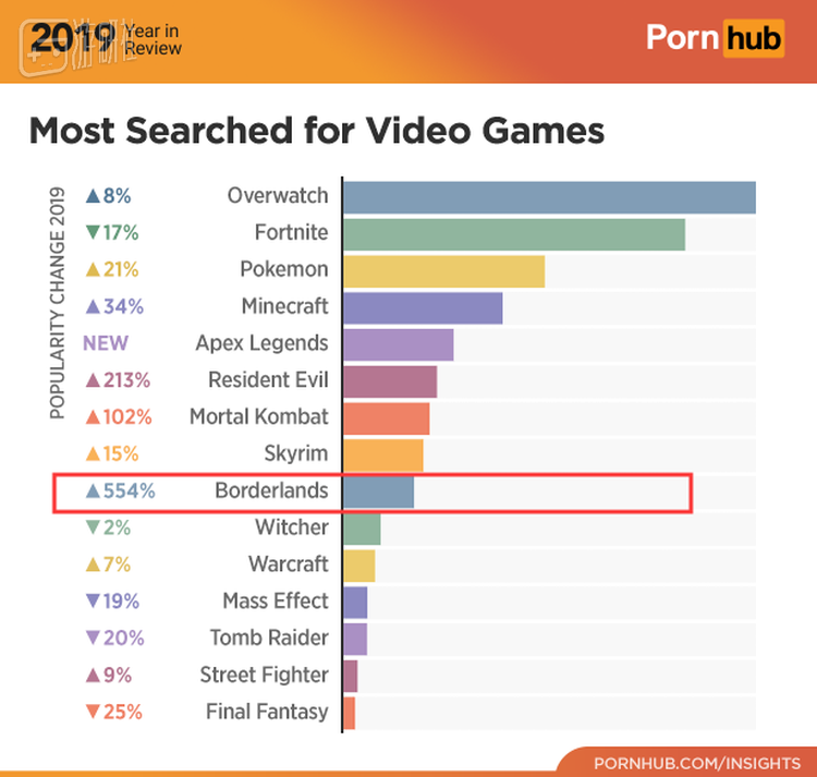 在Pornhub公布的数据中,“游戏搜索量排行榜”一直被人戏称为“游戏人气晴雨表”,而在过去数年里都很冷门的《无主之地》,在今年以554%的超高增长率成功在榜单中抢到一席之地,甚至超过了因为怀旧服人气上涨的《魔兽世界》和今年热门的《最终幻想》,就是不知道人们的这股新鲜劲还能维持多久……