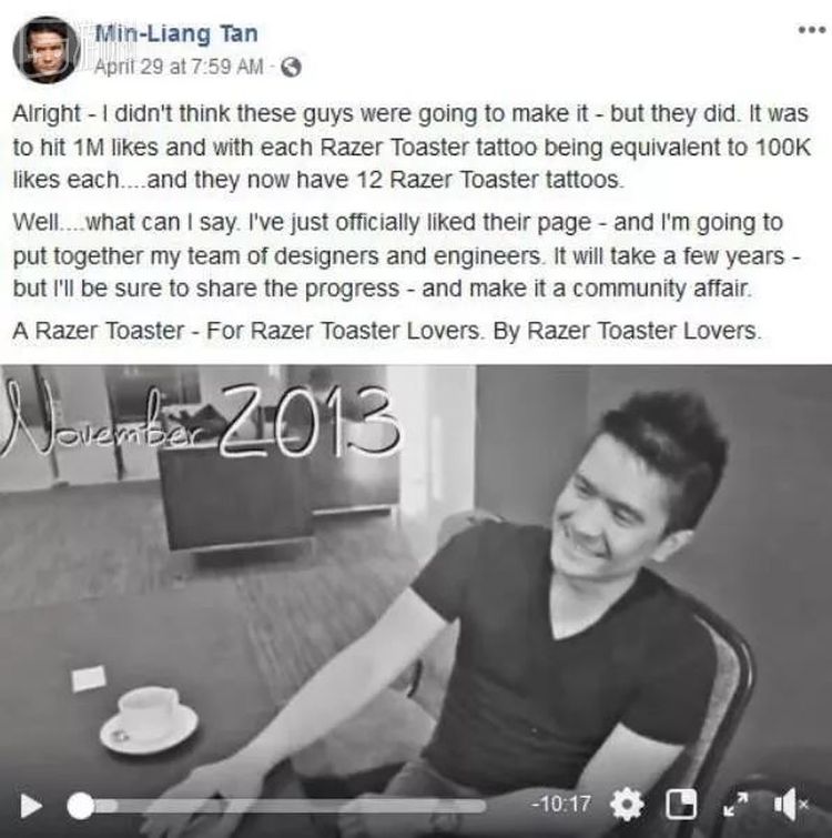 2013年曾有人和雷蛇CEO 陈民亮打赌,只要雷蛇面包机的脸书主页达到一百万点赞就推出烤面包机,没想到最后还真的成了,今年陈民亮正式宣布会把面包机变成现实。