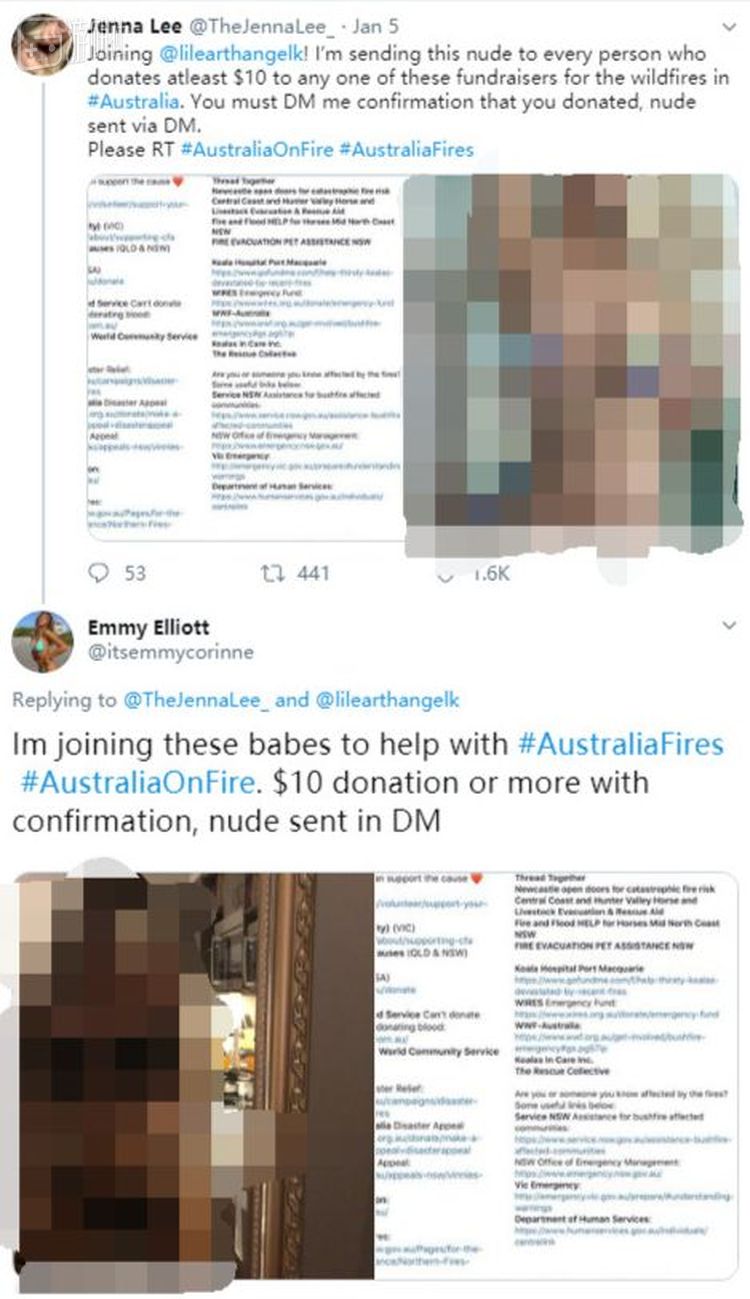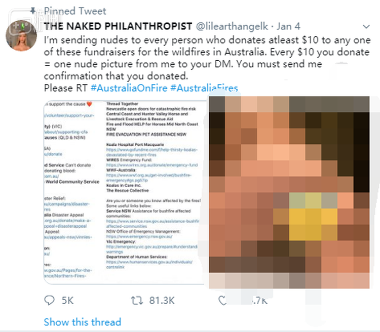 “向上述这些支援澳大利亚大火的慈善机构捐款至少10美元的人,将得到一张我的免费裸照。每捐10美元,我就会私信你一张。但必须要给我看捐款的确认信”。几天之前,凯伦发了这条消息到推特,还配上了一张自己的性感照片。