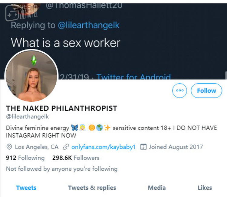 现在,她的推特账号已经改名为裸体慈善家。而账号背景则换成了一则网友对她提问的截图:“什么是性工作者?”