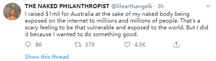 随着话题热度提升,也有人开始质疑凯伦的目的并不单纯——怀疑她的募捐行为只是为了给自己涨粉。这样的言论算是不少,凯伦不得不多次做出回应,在一条推特里,她说:“我在互联网上把赤裸的身体暴露给成千上万的人,为澳大利亚筹集了100万。如此脆弱地暴露在世界面前的感觉非常可怕。但我想做点好事。”。