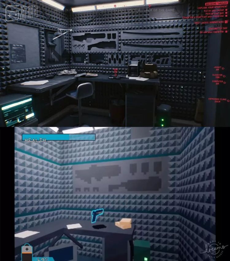 目前的版本中,Bearly Regal还原了主角公寓和市场部分。在公寓中玩家可以接受任务、更换装备,连预告片里墙上没有解锁武器的细节都被他添加到了游戏中。