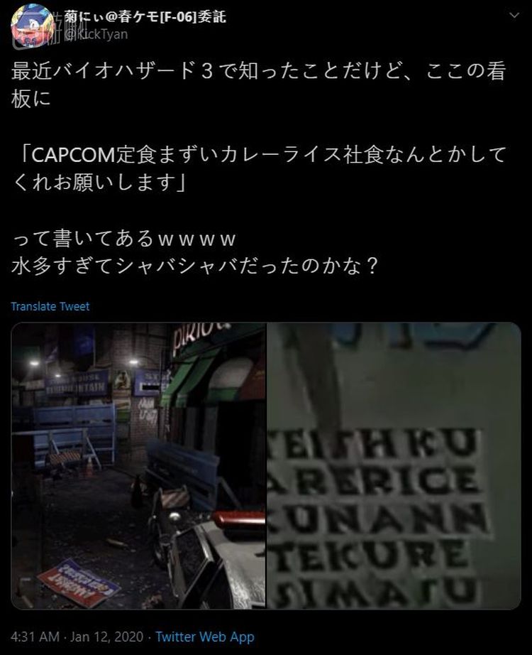 前两天,一个日本网友在重温《生化危机3》的时候,突然发现,场景里有一块看板上的文字看起来是英文乱码,却提到了开发商卡普空的名字。