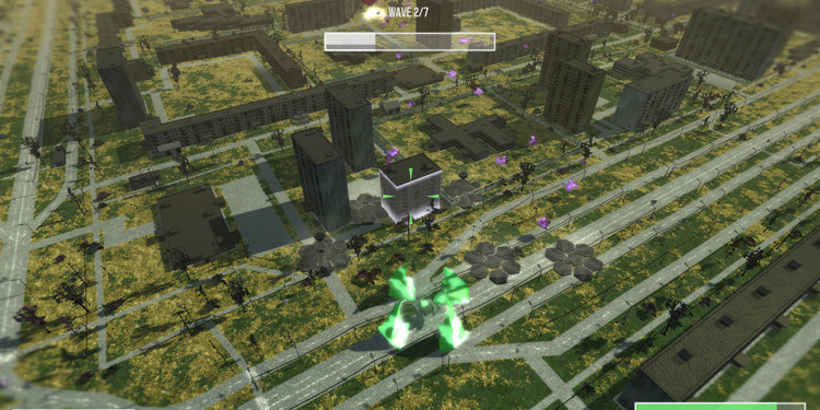 在整个游戏里,你能做的就只是开着一架绿色的小飞机飞来飞去,按鼠标左键或者右键可以“biu biu biu”地发射激光。打碎地面上的一些外星晶体可以收集能量,收集满了之后游戏就会化身塔防模式,需要抵挡几波敌人,然后再次上路。