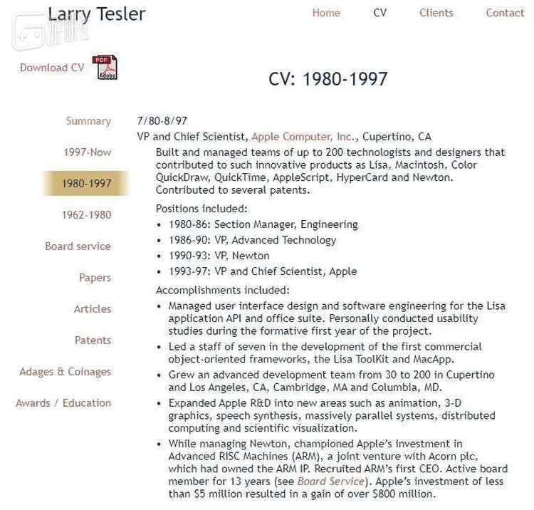 拉里在苹果一共干了17年,从事过Macintosh、QuickTime 、Lisa以及Newton平板电脑等多款产品的开发工作,最高达到了副总裁兼首席科学家的地位。