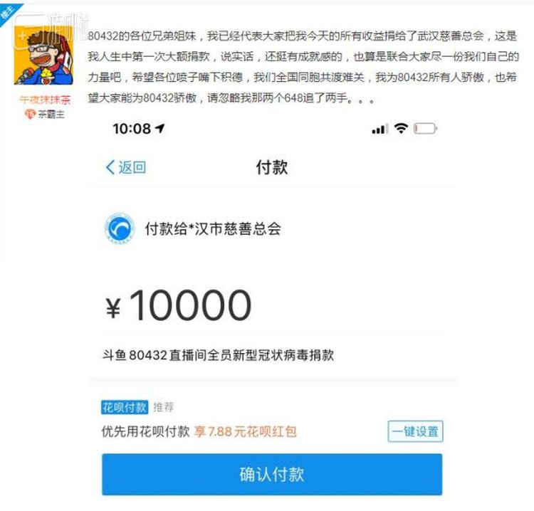 类似的捐款行为,也在主播间席卷开来。三万块钱,打给武汉市慈善总会,这是主播“午夜抹抹茶”的第一次大额捐款。但名义上,又不仅是他的。因为在捐赠人姓名这里,午夜抹抹茶填进去的是“直播间全员”——观众也有份。