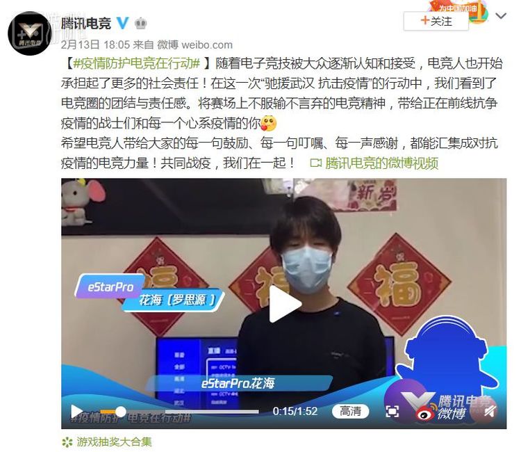 很多电竞选手并没有想到自己会有这样的时刻:他们站在镜头前,叮嘱大家“多洗手”“少出门”。