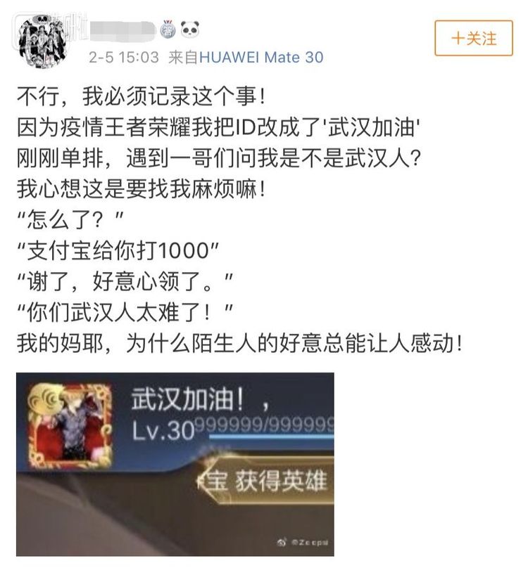 疫情爆发的档口,全民一片忧心,那时似乎是这期间的至暗时刻。就在这会儿,微博上一个博主把ID改成了“武汉加油”。于是进了游戏,一切就不再平常,一位陌生人私信问他是不是武汉人,而询问的原因则是想“支付宝给你打1000”。“为什么陌生人的还以总能让人感动”,博主说。而这件看似不经意的,游戏里的小事,也成了那一天的“清流”。
