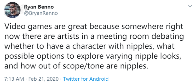 近日来,一条有关游戏中乳头的推文就得到了不少人的关注:“电子游戏之所以伟大,是因为现在世界上的某个地方,一个会议室里,一些画家正在讨论是否应该让某角色有乳头,并极力探索不同的的乳头外观,以及其范围/色调。”