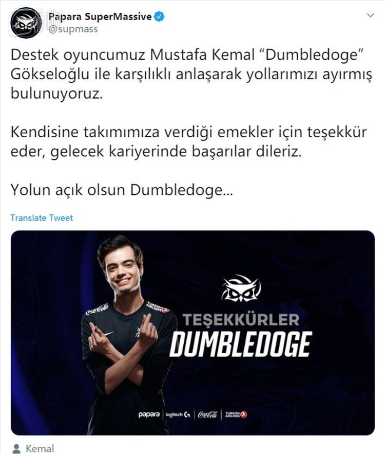 事发后Dumbledoge所在俱乐部Supermassive很快发布信息,官方宣布了Dumbledoge的离队。