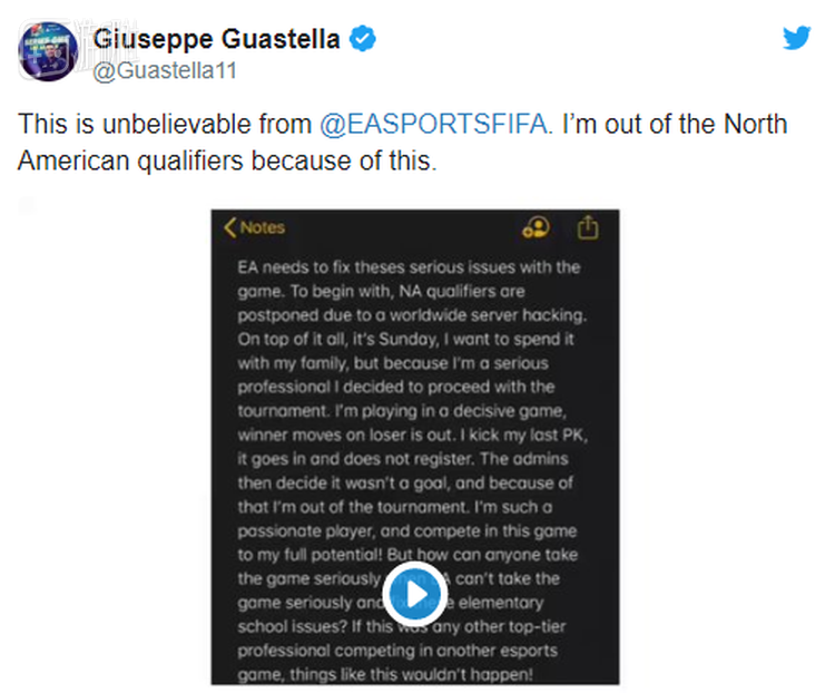 EA的决定最终没有更改,即使此时Giuseppe那段点球视频已经在推特上被播放了近50万次、不断有人在评论区吐槽官方的各种迷惑行为,但选手们依旧受到了重赛的决定。