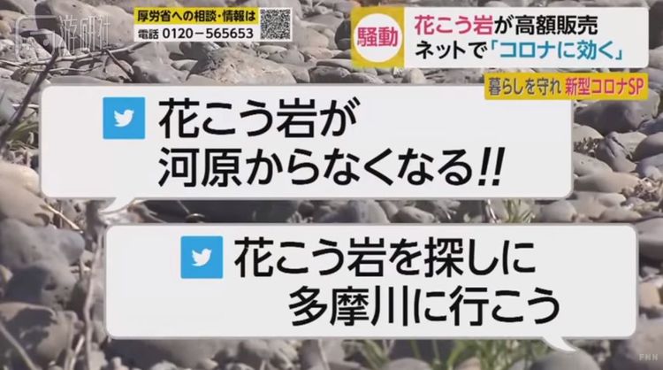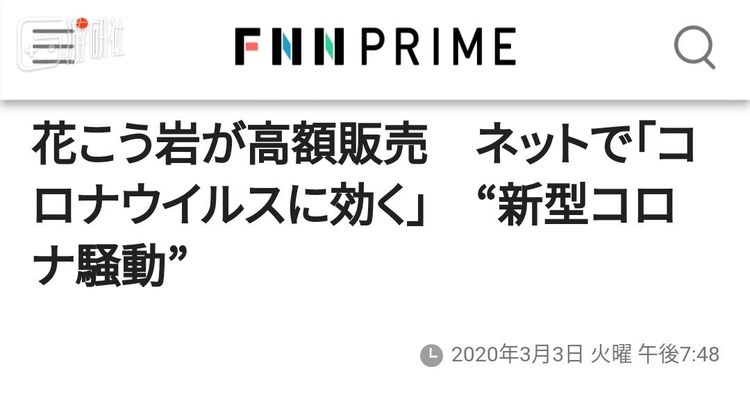 富士电视台旗下的FNN一看势头不对,赶紧在3月3日以 「花岗岩高价售卖,网传‘对新冠病毒有奇效’——形成新型冠状骚动」 为标题对该事件进行了报导: