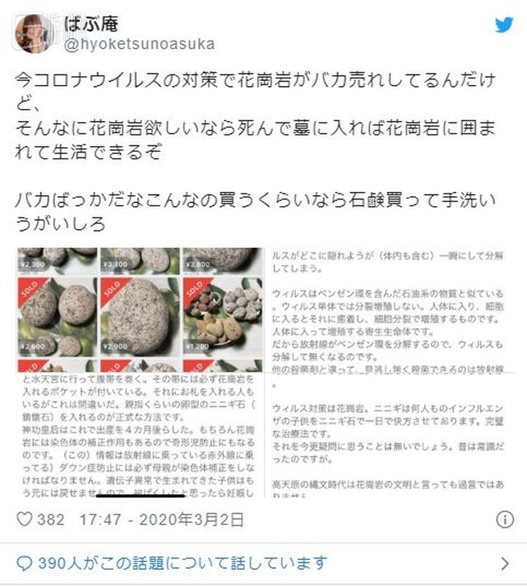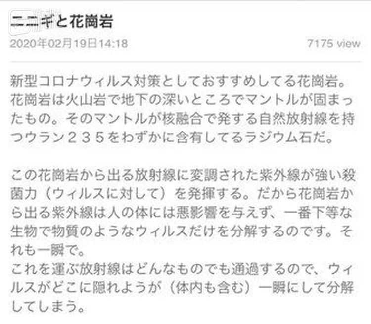 趁着时下的“热点”,为了贩卖自家含有花岗石成分的产品,日本一家三流营销号不嫌事大地放出消息称:花岗岩可以治疗新冠肺炎。