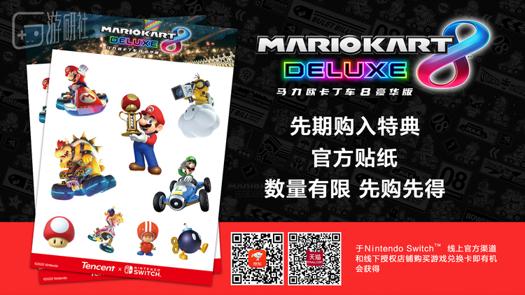 特典数量有限,先购先得。如购买《马力欧卡丁车8 豪华版》,将有机会获得官方贴纸一套。