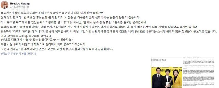同样是电竞选手出身,身为韩国议会议员的黄渡鹤也对柳浩贞提出异议。他认为人们不应该看轻借租账号代练这样的问题,因为这种问题等同于代替他人参加考试,为此他提到了曾经因代练而被取消职业选手资格的玩家Dopa。黄渡鹤还质问正义党,作为正义党推举的头号代表,这种行为是否能被称之为正义。