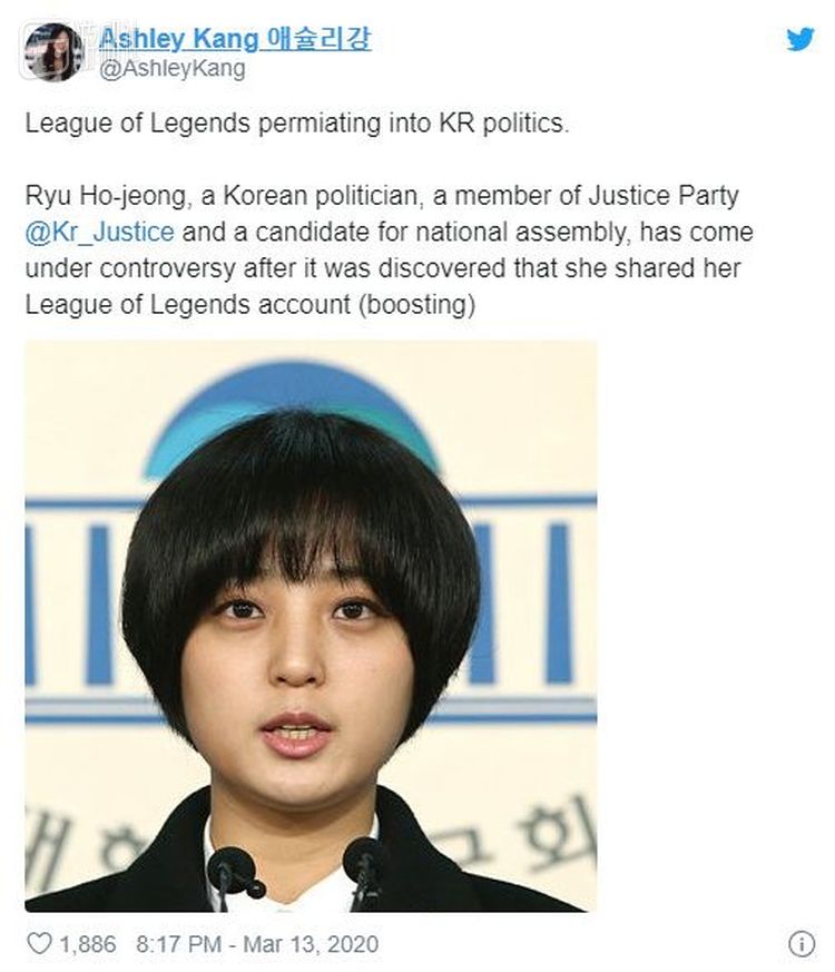 然而没过多久,这位代表的“黑历史”被网友们扒出。一位电竞记者发现,六年前柳浩贞曾经是梨花女子大学电竞社团负责人,当时被发现其《英雄联盟》账号有被他人使用,段位从黄金5提升到了钻石1,交换账号的事情被发现当时令她失去了电竞社成员的身份。记者将此事曝光在Twitter上,引起了人们热议。