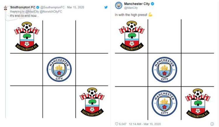 除了大家想得到的足球游戏,有些球队还想出了更简单粗暴的线上对决方案,比如南安普顿和曼城,直接在推特上下起了“井字棋”: