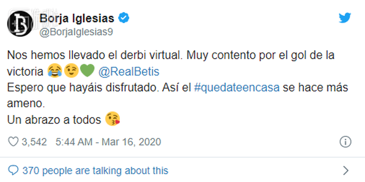 “给所有人一个拥抱!” 博尔哈兴奋地写道。“我参加了线上比赛,且非常高兴能够用游戏中的自己打入致胜球。”