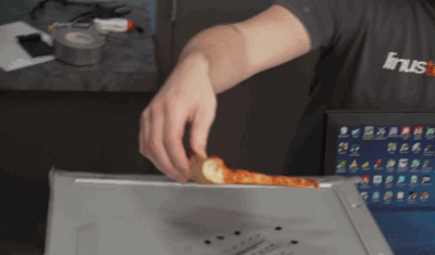 最难能可贵的是,这位电脑菜原教旨主义者坚持就地取材的原则,烹饪中尽可能的利用电脑本身的零件。