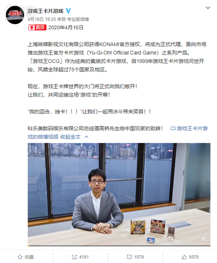 一个名为“游戏王卡片游戏”的蓝V账号,发布了游戏王官方卡片游戏(Yu-Gi-Oh! Official Card Game)正式入华的消息,同时由科乐美数码娱乐有限公司总经理高桥先生亲自录制了一段视频,确认将官方主办的活动与比赛——乃至简体中文版本卡片的制作与发行提上了日程。